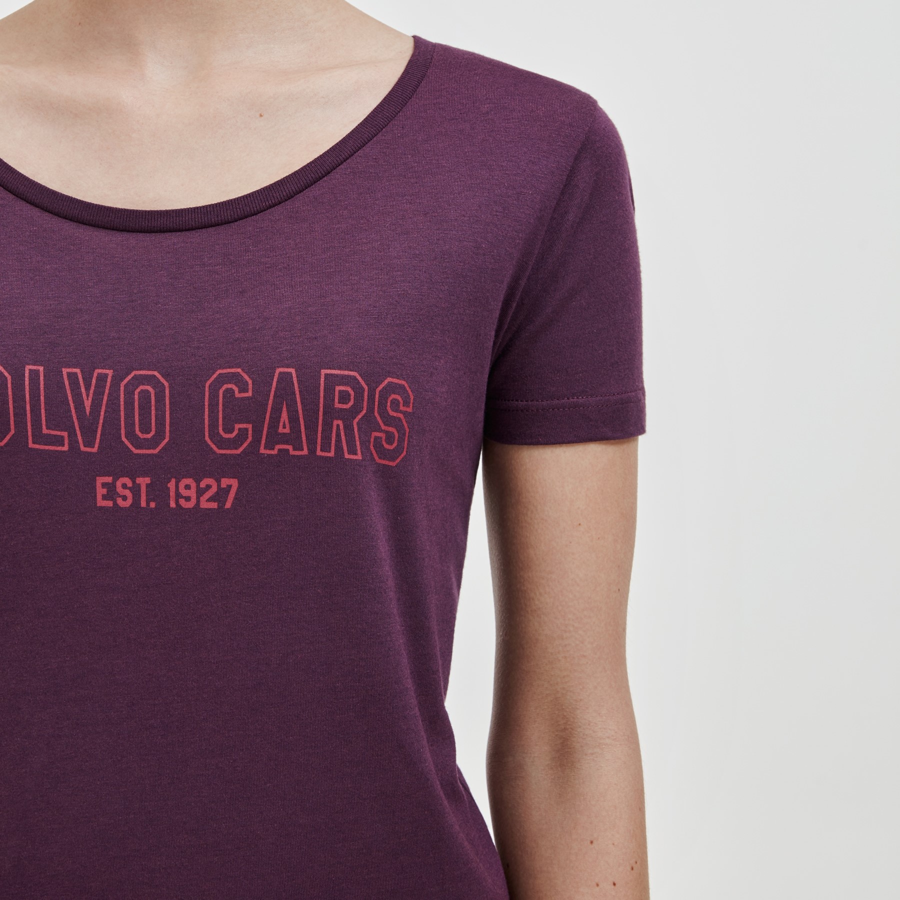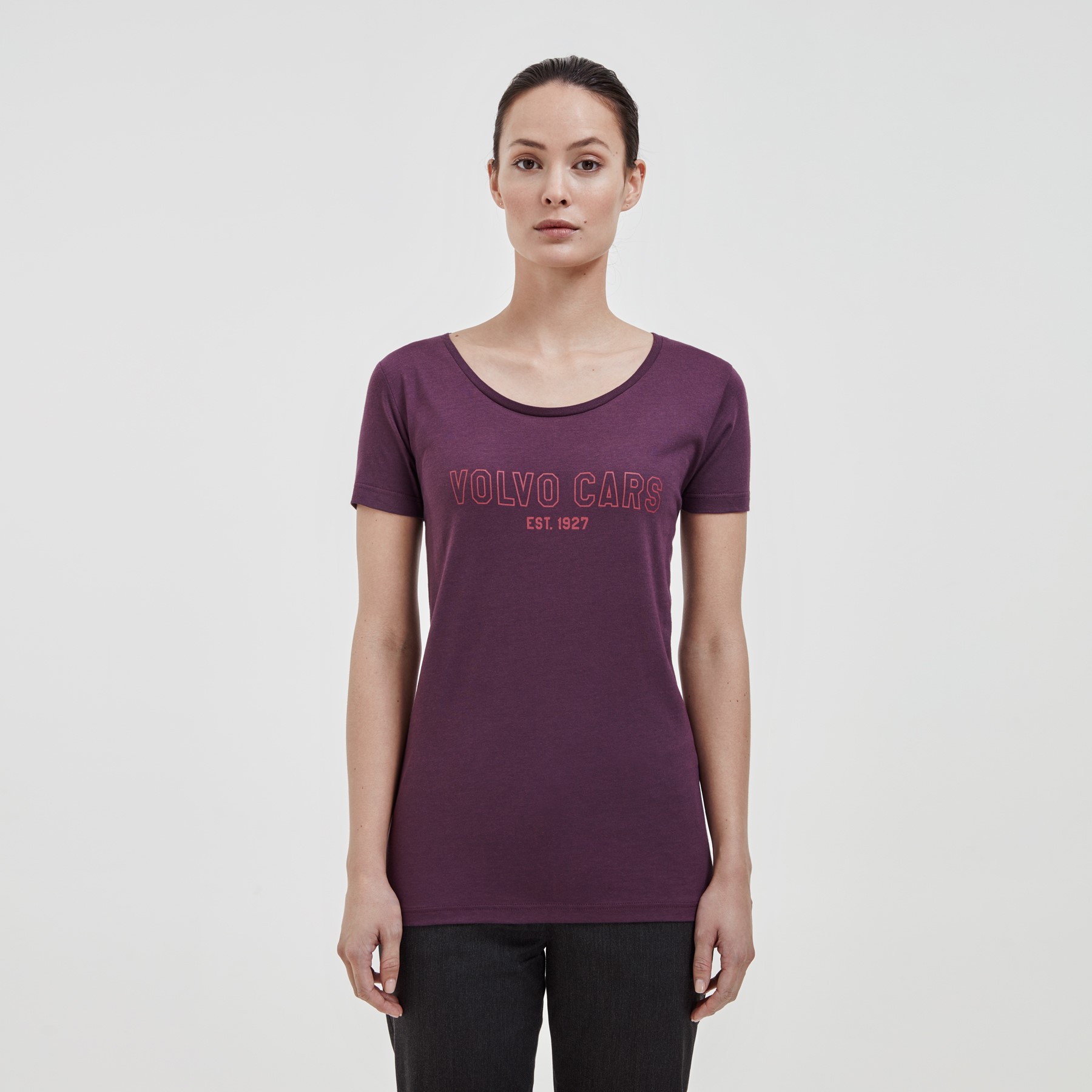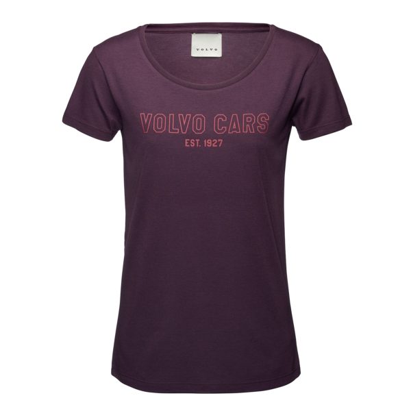 Camiseta feminina de cor roxa, feita de bambu sustentável com as palavras ‘Volvo Cars Est. 1927 ‘impresso nele. É composto por 70% de viscose de bambu e 30% de algodão orgânico.