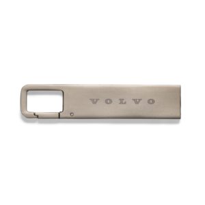 Chaveiro Powerbank laranja para carregar telefones, com um capacidade de 2600 mAh. Vem com um cabo de carregamento para telefones Android e iPhones com o logotipo da Volvo Cars gravado na superfície.