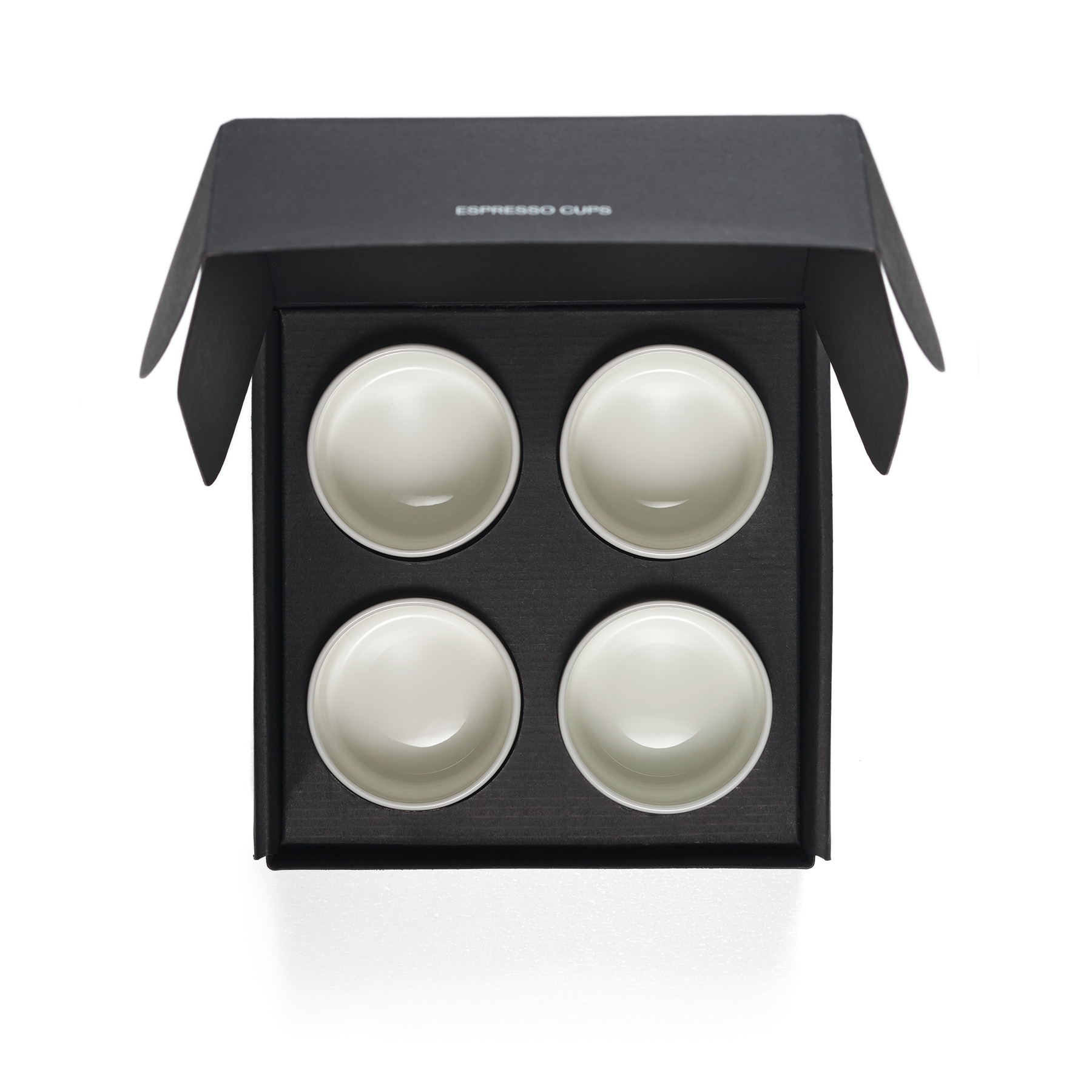 Esta xícara de café espresso é feita de porcelana fina, possui 2 mm de espessura e o nome Volvo em relevo ao redor da base. Altura 6 cm, diâmetro 5,8 cm. Cada kit contém 4 xícaras.